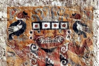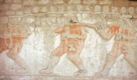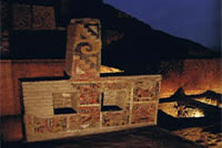 Anche alcuni ambienti interni del tempio, presentano pitture murali e bassorilievi, e file di guerrieri in armi con processioni di prigionieri pronti per essere immolati adornano tutte le pareti della rampa d’accesso all’edificio principale.